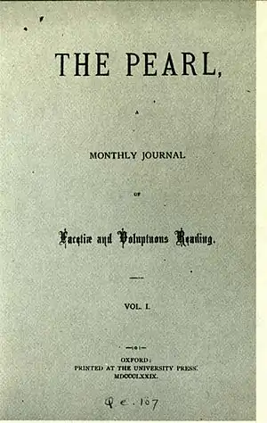 The Pearl ran for eighteen issues from July 1879 to December 1880, with two Christmas supplements. As an underground publication, it was limited to 150 copies and cost twenty-five pounds, which made it unusually expensive relative to comparable contemporaneous pornographic periodicals. The Christmas Annual, a crudely produced supplement that ran sixty pages, sold for three guineas. Only the special numbers contained illustrations. The publisher and editor, William Lazenby, also wrote some of the content.[1] The magazine was distributed discreetly through mail order.[2] Based on the cost and subject matter, the target audience appears to have been middle- and upper-class professionals.[3] Two of the flagellant poems were composed by Algernon Charles Swinburne, though it is unclear whether he authorized their publication.[4] The format of the magazine, in combining a mix of short stories, serial fiction, current events, and letters to the editor, parodied contemporary family magazines such as Englishwoman's Domestic Magazine, which itself contained depictions of corporal punishment.[5] Parts of the magazine were later compiled and translated into German.[6]