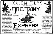 The Pony Express is an American silent fiction film[1] produced by Kalem Company and directed by Sidney Olcott with Sidney Olcott, Robert Vignola and Joe Santley in the leading roles. It was the first movie on the Pony Express.[2]