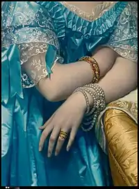 The Princesse de Broglie is shown in three-quarters view, her arms resting on a lavishly upholstered, pale gold damask easy chair. Her head is tilted to the viewer's left, and her black hair tightly pulled back and bound by blue satin ribbons.[7] She is pictured in the family home at 90 rue de l'Université in Paris,[8] in an evening dress that implies she is about to go out for the evening.[17] She is dressed in the height of contemporary Parisian fashion,[18] in particular the opulent Second Empire fashions then current in clothing, jewelry and furniture. She wears a gold embroidered evening shawl,[5] and an off-the-shoulder,[16] pale blue satin hoop skirt gown,[19] with short sleeves and a lace and ribbon trim, highly emblematic of 1850s evening dress. Her hair is covered with a sheer frill trimmed with matching blue ribbon knots, and is swept back with a centre parting.