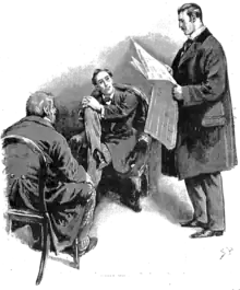 ![]() Duncan Ross shakes Jabez Wilson's hand with Vincent Spaulding looking on, 1891 illustration by Sidney Paget | |||