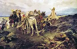 The painting depicts Muhammad XII, the last Nasrid ruler of Granada, turning to take his final look at the city from the Puerto del Suspiro del Moro before going into exile.[1][lower-alpha 1][4] Boabdil was upbraided by his mother, Aixa; “weep like a woman for the kingdom you could not defend like a man.”[5] Historians have generally followed Aixa in condemning Boabdil, but a 21st-century revisionist view by Elizabeth Drayson, a historian at the University of Cambridge, sees him as; “a last stand against religious intolerance, fanatical power and cultural ignorance”.[6][lower-alpha 2] The writer Giles Tremlett, in his 2012 study, Ghosts of Spain, notes the traditional name for the road Boabdil took, "La Cuesta de Las Lágrimas - the Slope of Tears".[4]