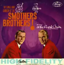 The Smothers Brothers at the Purple Onion, released May 1, 1961 on Mercury Records, is the first album released by the Smothers Brothers and established their reputation as folk music satirists. The Purple Onion was a celebrated comedy and music club in the North Beach area of San Francisco that also launched the careers of The Kingston Trio and Phyllis Diller, besides the Smothers Brothers. The album's full cover text is: The Songs and Comedy of the Smothers Brothers! Recorded at the Purple Onion, San Francisco, and is Mercury catalog number MG 20611 (monaural), and SR 60611 (stereo). It is sometimes referred to as Live at the Purple Onion.