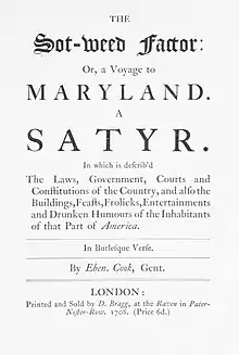 "The Sot-Weed Factor: Or, a Voyage to Maryland. A Satyr" is a satirical poem written by British-American poet Ebenezer Cooke, and first published in London in 1708.