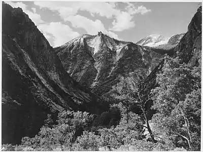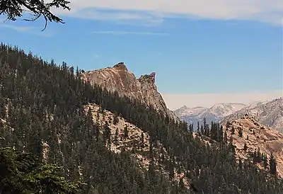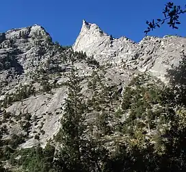 The Sphinx is a 9,143-foot-elevation (2,787-meter) double summit granitic pillar located west of the crest of the Sierra Nevada mountain range, in Kings Canyon National Park, in Fresno County of northern California.[3] This landmark is situated at the northern end of the Great Western Divide, two miles southeast of Kanawyers, five miles northwest of North Guard, and immediately south of the confluence of Bubbs Creek and South Fork Kings River. Topographic relief is significant as the north aspect rises 4,000 feet (1,200 meters) above the canyon in one mile. This geographical feature was named in 1891 by John Muir.[4] This feature's name has been officially adopted by the United States Board on Geographic Names.[3] The Sphinx formation is the further north and slightly lower of the two peaks, and was the first rock climb done in the Kings Canyon region.[5] The first ascent of the summit was made July 26, 1940, by Art Argiewicz and Bob Jacobs.[6] The North Buttress was first climbed October 18, 1970, by Fred Beckey, Greg Donaldson, and Walt Vennum.[7]