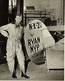 To accurately depict the transatlantic flight, three replicas, at a cost of $1.3 million (equal to $14.2 million today), were made of the Spirit of St. Louis for the various filming units stateside, in Europe and in the studio.[12] Stewart purchased a similar Ryan Brougham that was modified under Lindbergh's supervision. In 1959, Stewart donated the aircraft to the Henry Ford Museum in Dearborn, Michigan.[13] The second replica was donated to the San Diego Aerospace Museum but was destroyed in 1978 when a fire gutted the Electric Building in Balboa Park that housed the museum.[14] The third replica is displayed in the Missouri History Museum in St. Louis.[15]
