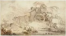 The Storm (French: L'Orage) (also known as The Stalled Cart or Wagon in the Mud French: La Charrette embourbée)[1][2] is an oil on canvas painting by Jean-Honoré Fragonard that hangs in the Louvre. Painted during his time in Rome, it was inspired by the caravan pictures of Giovanni Benedetto Castiglione that were particularly admired in Paris.[3] The painting, 0.73m high and 0.97m wide, was a bequest to the Louvre in 1869 from the collection of Louis La Caze. It was completed around 1759.[4]