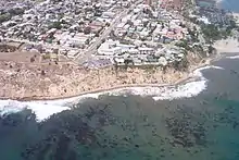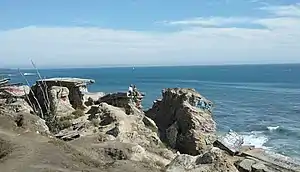 The Sunken City is the site of a natural landslide which occurred in the Point Fermin area of the San Pedro neighbourhood of Los Angeles, starting in 1929. A slump caused several beachside homes to slide into the ocean. The development of cliffside homes and exclusive bungalows was established in the 1920s by George H. Peck to attract people who wanted to live with a view of the Pacific Ocean.[1] Experts investigating the landslide said that the ground was shifting at a rate of 11 inches (280 mm) per day. The landslide occurred at the southern tip of San Pedro, sending nearly 40,000 square feet (3,700 m2) into the Pacific Ocean.[2] The area is still visited by sightseers.