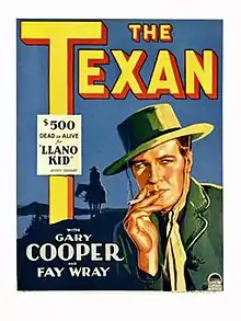 The Texan is a 1930 American Western film directed by John Cromwell and starring Gary Cooper and Fay Wray.[2] Based on the short story "The Double-Dyed Deceiver" by O. Henry, the film is about a daring bandit called the Llano Kid who shoots a young gambler in self-defense and is forced to hide from the law. He is helped by a corrupt lawyer who involves the bandit in a scheme to swindle a Mexican aristocrat whose son turns out to be the young gambler killed by the Llano Kid. The screenplay was written by Daniel Nathan Rubin, and the story was adapted for the screen by Oliver H.P. Garrett and Victor Milner. Produced by Hector Turnbull for Paramount Pictures, The Texan was released in the United States on May 10, 1930.[3] The film received positive reviews upon its theatrical release.[4]