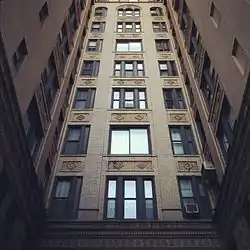 The building features many turn of the 20th century architectural details, including a 2-story limestone base embellished with male and female figures, arched windows on the first floor, and the second floor boasts attractive ornamental wrought iron planting window balconies.[1]