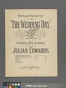 The Wedding Day is a comic opera in three acts with music by Julian Edwards and a libretto by Stanislaus Stange. Prior to a production on Broadway, the work premiered for the grand opening of the newly renovated Wieting Opera House in Syracuse, New York, on September 15, 1896.[1][2] It was staged at The Boston Theatre where it began a two-week run on February 7, 1897.[3] Critic Roland Burke Hennessy of The Illustrated American wrote, "I consider The Wedding Day to be by far the best native comic opera we have had in many a year."[4]