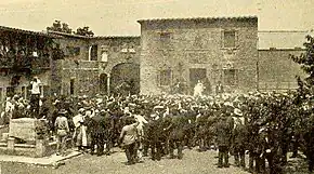 The entire production was filmed in Fort Lee at Fox's facilities located near the intersection of Main Street and Linwood Avenue.[14] Rather than going on location, traveling from New Jersey to Mexico with a large company of actors, crew, and other support personnel, Powell in the early months of 1915 had decided to send his scenic designer, J. Alan Turner, to Mexico to locate, photograph, and sketch the architecture, attire, and daily activities in a "typical village" there. Then, on his return to Fort Lee, Turner supervised the construction on Fox studio's backlot a 10-acre set with full-size replicas of the Mexican buildings he had documented in San José in Sonora.[15] The trade journal Motion Picture News regularly updated its readers on the production's development, noting that Powell spent more than $10,000 ($289,000 today) on the Mexican set. "The village", it reported, "is the result of the joint efforts of Mr. Powell himself, J. Alan Turner, who is known as a builder of expositions, and William Bach, the technical director of the Fox studios".[16]