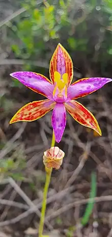 Thelymitra pulcherrima, commonly called the northern Queen of Sheba,[2] is a species of orchid in the family Orchidaceae and endemic to the south-west of Western Australia. It has a single erect, spiral, dark green leaf with a purplish base and up to seven glossy, variegated flowers with the sepals and petals differing in colour. The petals and sepals and basically reddish or purplish but with streaks and blotches of contrasting colours. There are two bright yellow or orange arms on the sides of the column.