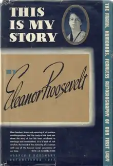 Eleanor wrote This Is My Story in 1936.[2] The book was published in 1937 by Harper & Brothers. The first edition was 365 pages.[3] It was an autobiographical account of Eleanor's life to shortly before Franklin's involvement in Al Smith's campaign for governor of New York in 1924.[1][4][5] It was Eleanor's first autobiographical work to be published.[6] The book was serialized in the Ladies' Home Journal, which she had previously written for. The editors of the journal paid $75,000 for the rights.[7] Publication in the Journal and the book were both very successful[8]the book's first installment in the Ladies Home Journal sold 250,000 copies. The editors of the journal wrote that they made "the exciting discover that Eleanor Roosevelt's autobiography was read, in effect, by everyonein government, parlors, and slums."[9] That year, Eleanor made $75,000 (equivalent to $1,526,736 in 2022), in part from the book (and also from speaking and publishing other works), which was more than her husband.[8]