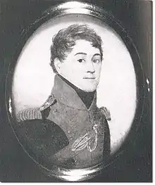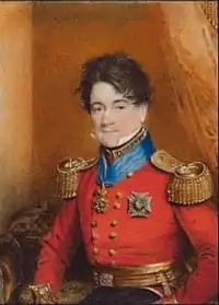 Portrait miniature by Charles Foot Tayler, painted 1821, showing Hawker "wearing staff uniform, his scarlet coat with gold epaulettes, his black collar with gold lace, gold waist-sash, the belt plate with royal cipher"[1]