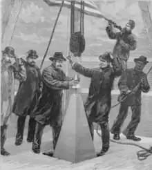 P. H. McLaughlin setting the capstone (aluminum apex) on the Washington Monument. Colonel Thomas Lincoln Casey has his hands up.