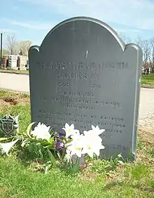 Higginson died May 9, 1911. Although his death record states that he was buried at Mount Auburn Cemetery in Cambridge, Massachusetts, he is actually buried in Cambridge Cemetery in Cambridge, Massachusetts at the intersection of Riverview, Lawn, and Prospect paths.[41][42]