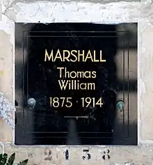 In 1910, Thomas William Marshall married Marie-Louise Désagullier[10] who had been his companion and model for many years. He died prematurely from tuberculosis[11] on September 2, 1914 in Paris, at the age of 38, at the height of his talent. He was cremated at cimetière du Père-Lachaise and his ashes are resting at the columbarium (87th division, niche n° 2137).