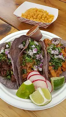 The restaurant uses Portland-based Three Sisters Nixtamal for the blue corn tacos; meatless taco varieties include cactus, mushroom, and vegetable stew, with avocado, cilantro, onions, and pico de gallo as toppings.[10] The tlayuda has avocado slices, a black bean spread, cabbage, cilantro, onion, queso Oaxaca, and queso fresco. Suzette Smith of the Portland Mercury said the tlayuda is "massive and comes in a pizza box, along with a suggestion to split it between two".[11]