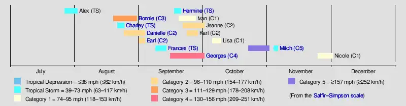 The 1998 Atlantic hurricane season was an event in the annual tropical cyclone season in the north Atlantic Ocean. This Atlantic hurricane season saw an above-average number of named tropical storms,[1][nb 1] and included a single-day record for number of hurricanes simultaneously in progress, with four active on September 25: Georges, Ivan, Jeanne and Karl.[3] The season officially began on June 1, 1998 and ended on November 30, 1998. These dates, adopted by convention, historically describe the period in each year when most tropical systems form.[4] Even so, this season's first storm, Tropical Storm Alex, did not form until July 27, while its last, Hurricane Nicole, dissipated on December 1.