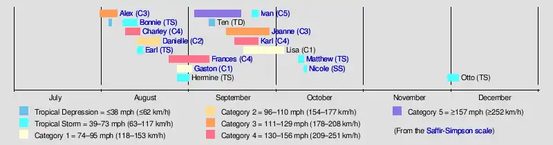 Subtropical Storm Nicole (2004)Tropical Storm Matthew (2004)Hurricane Karl (2004)Hurricane JeanneHurricane IvanHurricane Gaston (2004)Hurricane FrancesTropical Storm Earl (2004)Hurricane Danielle (2004)Hurricane CharleyTropical Storm Bonnie (2004)Hurricane Alex (2004)Saffir-Simpson scale
