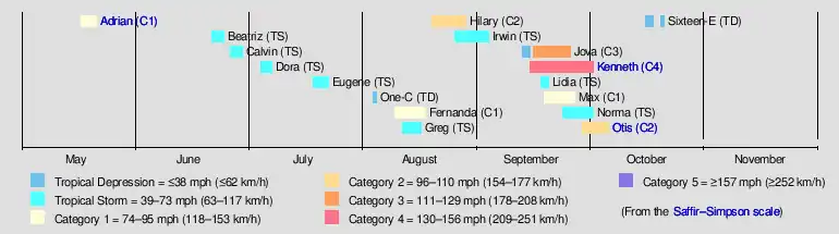 The first storm of the season, Hurricane Adrian, formed off the southwest coast of El Salvador and made the closest approach of any hurricane to the country on record. Most of June was quiet until the end of the month, when two tropical storms developed. July remained inactive as well, as only two tropical storms formed. In August, the activity picked up somewhat; the Central Pacific had its first and only depression of the year and four tropical storms, two of which became hurricanes, forming in the Eastern Pacific. September was the most active month of the year; six tropical storms formed, four of which became hurricanes, and two of the hurricanes strengthened further to become the only major hurricanes of the year. The strongest storm of the season was Hurricane Kenneth, whose remnants briefly threatened Hawaii near the end of the month. Activity sharply dropped off in October as only one tropical depression formed. No storms formed in November in both basins, and the season ended on November 30.