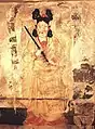 On the Western wall of the tomb, there are twelve people in the orchestra. In the front row there are five women (from right to left) playing the konghou (箜篌; bow harp), the guzheng (古箏; an 18–23-stringed plucked zither with moveable bridges), pipa (琵琶; lute), paiban (拍板; bamboo clapper) and dagu (大鼓; bass drum) while, in the back row, there are seven women playing the sheng (笙; mouth organ), fang xiang (方響; Chinese metallophone), dalagu (答臘鼓;[3] West Asian cylindrical drum),[4] two bili (篳篥; oboes), and two bamboo transverse flutes (hengdi 橫笛 or dizi 笛子).[5] At the far right of the front row is a female conductor dressed like a man with two children dancers in front of him.[5]