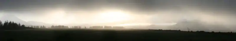 Panorama of Mount Ruapehu and Mount Ngauruhoe looking west from the Desert Road in January 2015