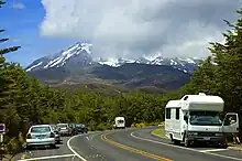 Ruapehu seen from Whakapapa Village, Tongariro National Park. This road climbs to Iwikau Village, which provides access to ski fields.