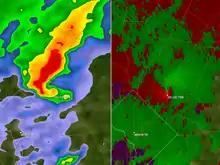 A Doppler weather radar image of the College Park tornado near its peak at 21:21 UTC