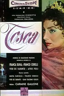 Tosca is a 1956 Italian musical melodrama film directed by Carmine Gallone and starring Franca Duval, Afro Poli and Franco Corelli.[1] It is based on the 1900 opera Tosca by Giacomo Puccini, which was adapted from the 1887 play by Victorien Sardou. It was made at Cinecittà in Rome.