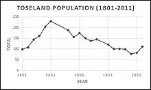 In the period 1801 to 1901 the population of Toseland was recorded every ten years by the UK census. During this time the population was in the range of 99 (the lowest was in 1801) and 230 (the highest was in 1851).[1]