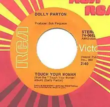 "Touch Your Woman" is a song written and originally recorded by American singer-songwriter Dolly Parton. It was released on February 14, 1972 as the only single from the album of the same name. It provided a 1972 top-ten country single for her. A tranquil, slow-tempo ballad, the song differed from many of Parton's other hits at the time, in that it was neither an upbeat, lilting country number, nor a nostalgic reminiscence of her rural childhood. "Touch Your Woman" reached number 6 on the U.S. country singles charts in March 1972,[1] though a number of country radio stations refused to play it because they found it too sexually suggestive.[2] The song earned Parton a Grammy nomination for Best Country Vocal Performance, Female, at the 15th Annual Grammy Awards, losing to Donna Fargo's "The Happiest Girl in the Whole U.S.A."[3]