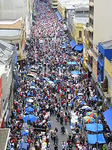 The LGBT Pride Parade is a tourist event in the city that attracted around 3.1 million people in 2009, surpassing large metropolises such as New York, which gathered 2.9 million people at its peak.[17] Normally, the event is launched by the mayor and the gathering starts at Paulista Avenue, with dispersal in the city center. Along the route, there are electric trios from organizations linked to the LGBT movement and from commercial establishments (such as nightclubs), which play different types of music.[18] Every year, the parade brings together several personalities. In 2015, global actresses Natasha Lyonee, Uzo Aduba and Samira Willey, from the famous series Orange is the New Black, attended the event. In 2016, the cast of Sense8 recorded scenes at the parade with their own electric trio.[19][20]