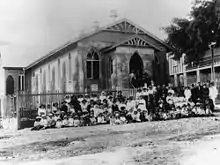 In 1893, a vacant Congregationalist church building and contents were purchased and re-erected on the Sturt Street site.[2][3] The first service was held in November 1893. In January 1903 the building was damaged by Cyclone Leonta. What could be salvaged was used to erect a church hall. Church records from 1912 reveal that this structure was intended to be temporary. A building fund was set up for a new church and hall, but it was not until 1922 that a replacement church was built. Lack of funds precluded a completely new building. Therefore a second hand one was found in the form of a disused powder magazine, eight miles from Townsville at Brookhill and purchased. The congregation dismantled and cleaned around 30,000 bricks. The building contract was signed for £832/6/- and the foundation stone was laid on 8 July 1922. It is highly likely that at this time the old timber church hall was attached to the rear of the new church.[1] The new church opened on Saturday 23 September 1922.[4][5]