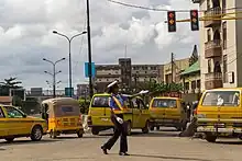 In the 2010s, the Congolese National Police deployed automated traffic police robots. Created by Thérèse Kirongozi, an engineer from the Democratic Republic of the Congo,[6] the tall solar-powered aluminum robots are positioned in intersections and are able to rotate, but cannot actually move; rather, they contain closed-circuit television cameras in their "eyes" that record offenders for human traffic officers to handle.[7] The robots also carry red and green lights to direct traffic, and can speak to pedestrians and help them cross roads.[8][9] Five robots were installed in intersections in Kinshasa by 2015, with thirty more planned for highway patrol purposes.[8]