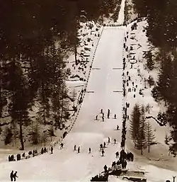On 17 March 1935, Swiss Fritz Kainersdörfer jumped 99.5 meters (326 ft) and set the only official world record on this hill. Later that day history was made, when Olav Ulland from Norway fell at 103.5 metres (340 ft) and became first man ever to beat one hundred meter mark in ski jumping, although it was invalid and didn't count as he should be standing for record to be officially recognized.[4][5][6]