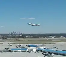 Air Force One takes off from Charlotte/Douglas International Airport, with the Charlotte skyline in the background