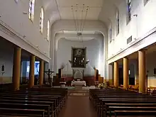 The church was built in 1934–36, designed by Tullio Rossi.[5] Behind the altar is a reproduction of Raphael's Transfiguration.