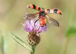 The adults can be encountered from May through August on the flowers, mainly Apiaceae, Asteraceae and Crataegus species, feeding on pollen. However, they integrate their diet with small insects that they actively hunt, especially Oedemera, Psilothrix, Stenopterus and Clytus species.
