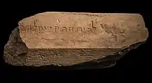 The Trumpeting Place inscription is an inscribed stone from the 1st century CE discovered in 1968 by Benjamin Mazar in his early excavations of the southern wall of the Temple Mount. The stone, showing just two complete words written in the Square Hebrew alphabet,[2][3] was carved above a wide depression cut into the inner face of the stone.[4] The first word is translated as "to the place" and the second word "of trumpeting" or "of blasting" or "of blowing", giving the phrase "To the Trumpeting Place". The subsequent words of the inscription are cut off. The third word (...לה), which is incomplete, has been interpreted as either "declare" or "distinguish", giving either: "to d[eclare (the Sabbath)]" or "to d[istinguish (between the sacred and the profane)]", where the words in square brackets represent scholarly conjecture.[2][4][5]