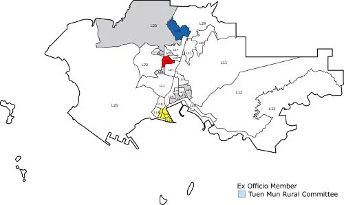 The Tuen Mun District Council (Chinese: 屯門區議會) is the District Council of Tuen Mun District, in the New Territories. It is one of 18 such councils. The Council consists of 32 members with 6 members of those elected through first past the post system every four years, 12 district committee members, 13 appointed members, and 1 ex officio member who is the Tuen Mun Rural Committee chairman. The latest election was held on 10 December 2023.