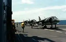 AV-8A Harriers of VMA-513 line up for launching from Belleau Wood in May 1982