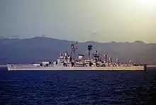 Canberra was recommissioned on 15 June 1956, and homeported at Norfolk, Virginia.[3] From June until March 1957, the cruiser operated from Norfolk and through the Caribbean.[3] On 14 March, Canberra delivered President Dwight D. Eisenhower to Bermuda for a conference with Harold Macmillan, the British Prime Minister.[3] On 12 June, the cruiser served as review ship for the International Naval Review at Hampton Roads.[4] After a training cruise during July and August, Canberra was deployed to the Mediterranean for NATO Operation Strikeback.[3]