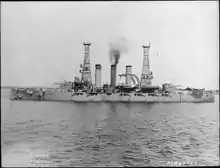 From September 1918 to the end of the conflict, Georgia was assigned to the Cruiser Force Atlantic as a convoy escort.[3] The ship's first operation was with troop ship convoy 67, which departed New York on 23 September; the rest of the escort consisted of the armored cruisers North Carolina and Montana and the destroyer Rathburne. Georgia had to take on 525 long tons (533 t) of coal in addition to her normal stocks, which significantly degraded her seakeeping characteristics. The ship accordingly had to be battened down to reduce flooding from heavy seas, which had the effect of hastening the spread of disease. During the cruise, the crew suffered from 120 cases of influenza and 14 cases of pneumonia; 7 men died from disease. Even with the additional coal, the ship did not have sufficient fuel to reach the hand off point and she had to break off from the convoy to return to port.[10] Germany signed an Armistice with the Allied powers, ending the war on 11 November. On 10 December, the ship was equipped to serve as a transport to carry American soldiers back from France. This duty saw the ship transferred to the Cruiser and Transport Force. She made five trips between December 1918 and June 1919, carrying almost 6,000 soldiers in total.[3] The first trip, made in company with the battleship Kansas, arrived in Brest, France on 22 December 1918.[11]