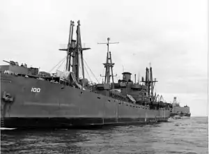 On 27 December 1943, Lynx, with Section 13 of the advanced base sectional dock ABSD-1 in tow astern, sailed as flagship of Task Group (TG) 116.15.3, Commander Arthur S. Walton, in company with sister ships Lyra, towing ARD-12, and Sculptor, with YRD(H)-1 astern, and Albireo, towing YRD(M)-1, escorted by the fleet tug Zuni, set course for the South Pacific. During the afternoon watch on 14 January 1944, Zuni left her position in the formation and came alongside, transferring Sea1c Hugh W. Morris, diagnosed with appendicitis, to Lynx, for medical treatment. Lieutenant Herman E. Wuestenfeld, MC-V(G),[lower-alpha 1] the cargo ship's medical officer, performed an appendectomy later that same day, 20:34-21:40.[4]