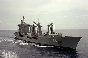 USS Merrimack (AO-179) was the third ship of the Cimarron-class of fleet oilers of the United States Navy. Merrimack was built at the Avondale Shipyards in New Orleans, Louisiana starting in 1978 and was commissioned in 1981 for service in the Atlantic Fleet. Total cost for the ship was $107.1 million. She was last homeported at Norfolk, Virginia. Between 1989 and 1991 Merrimack was "jumboized", meaning that, after cutting the ship into two sections after about a third from the bow, a 35.7 m long section was added to increase the fuel load. Merrimack was decommissioned on 18 December 1998 and struck from the Naval Vessel Register on the same day. Her title was transferred to the Maritime Administration. She was scrapped in Brownsville on 5 June 2013.