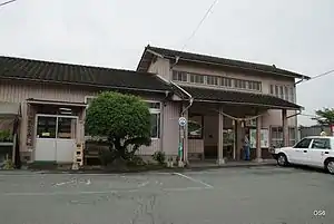 The station consists of an island platform serving two tracks at grade with a siding. The platform is accessed by a level crossing. The station building was a wooden structure of traditional Japanese design with a red tiled roof and housed a ticket window and a waiting room. This was damaged by earthquakes in 2016 and has since been demolished.[2][3]