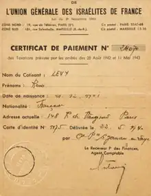 - ↑ "L'Union générale des Israélites de France (UGIF)" (PDF). Akadem (in French). Fonds Social Juif unifié, Holocaust Memorial Foundation. Retrieved 14 January 2021.