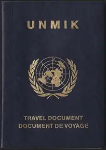 Between 2000 and 2008, UNMIK issued passport-sized travel documents to habitual residents of Kosovo for the purpose of foreign travel.[29][30] The document carried UNMIK travel document/titre de voyage on the cover, contained 32 pages and was valid for two years. The document contained a machine readable strip with the three-letter code "UNK" in place of a country code.[31][32]