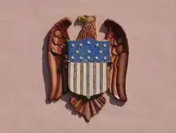 There is a small L-shaped lobby and two customer windows. The second floor is devoted to general working area and offices, along with a kitchen, bathroom and the roof terrace over the rear wing. A portion is believed to have been originally used as the Port Director's residence, as noted. Portions of the terrace have now been closed in or roofed. On the exterior, the first floor windows and doors on the north and east elevations are placed in large, slightly recessed arched openings, creating an arcade along the base of the building. Only the three doors on the north elevation have wood-paneled double doors. Only the original east entrance door, the present north entrance door and the north center door retain their original decorative glazed tiles in the lintels over the door. Only the north left and north center doors retain the decorative iron grille-work in the arch. The north center door has also retained its original ornamental ironwork gate in front of the wooden door. Between the second floor windows on the north side there is a large Terra-cotta U.S. Customs Service crest. On the east elevation the words, "U.S. Custom House," are located in masonry letters above the first-floor windows. On the interior, the lobby retains its original, ceiling, quarry-tile floor, and steps with polished-concrete treads. The original ornamental iron grille survives in the upper panel of the door to the general office and the cashier's window beside it.